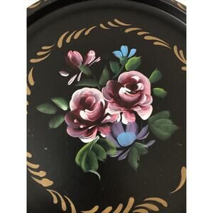 Nashco Toleware Hand Painted Flowers Round Metal Tray 11" Black Pink Blue Gold