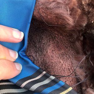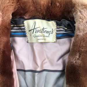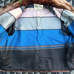vintage Armstrong's of Nashville plush shearling brown fur coat with satin-like lining in stripes of blue, grey, silver and pale pink.