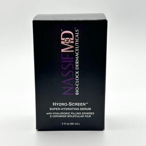 From Nassif MD. Bioclock Pharmaceuticals. Hydro screen super hydrating serum with hyaluronic filling spheres and ceramide molecular film. 2oz bottle in box with applicator.
