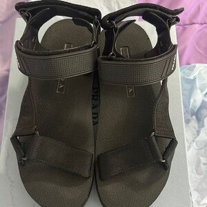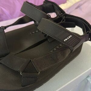 Step out in style with these elegant black sandals from Prada. Perfect for any occasion, these shoes offer both comfort and sophistication. Great for vacation and hiking through Italy or Amsterdam.