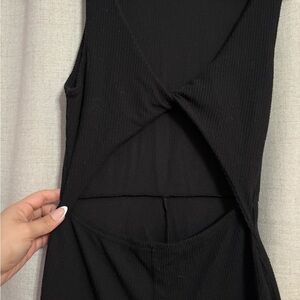Sleek black jumpsuit. Features a stylish cutout design. Perfect for any occasion.