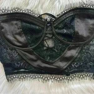 Back lace up corset top. Strapless. Eyelash & floral lace with satin accents. Side wire. Sheer lace with opaque cups. Cups are lined but not padded. No wire in cups. No flaws.