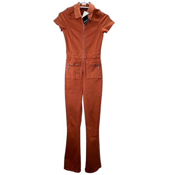 Nasty Gal Flare Jumpsuit Zip Front Denim Coral 2 Short Sleeve Pockets NWT
