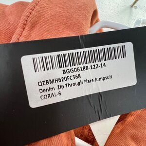 New with tags NastyGal Denim Zip Through Flare Jumpsuit in coral. Zip front, short sleeves, pockets, stretchy. US size 2.