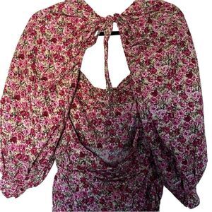 Trendy and stylish ruched mini dress features a gorgeous pink/gold/red floral pattern, long balloon sleeves and a side zipper closure. Dress ties between shoulders creating a sexy back cutout Excellent condition. Worn once. No flaws Figure flattering.