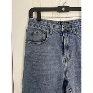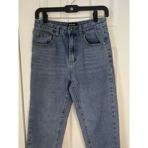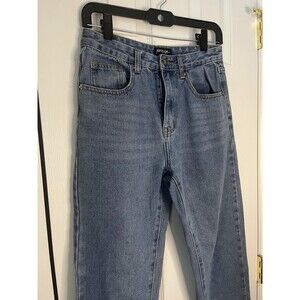 These Nasty Gal jeans are UK size 6 with a high-rise, straight leg style in a solid blue color. They feature a zip and button closure, made of light wash denim fabric with cotton material. The jeans have a mid-rise fit, adorned with button and zipper accents, and come with pockets for added convenience and comfort.
