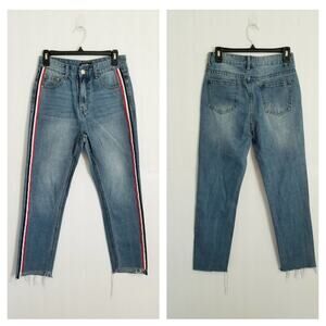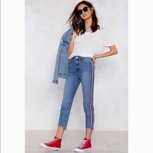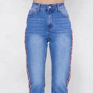 Nasty Gal Momokrom High-Waisted Side-Striped Jeans Size: UK 8, fits a US 26, see measurements. Blue wash high-waisted cropped raw hem jeans with a red, white and blue stripe down the side.