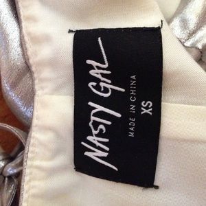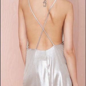 90s metallic silver dress from nasty gal! XS but runs a bit big (I wore it once and am a size small) - only worn once. Keyhole at neckline, cross back straps, side zip closure. Perfect party dress ! Color is "champagne." Polyester/Rayon. No trades !