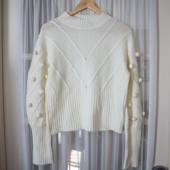 Nasty Gal Ivory Pom Pom Balloon Sleeve Mock Neck Sweater Size Medium