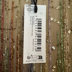 Vibrant beaded dress with vertical stripes. Features sequins and beads in multiple colors.