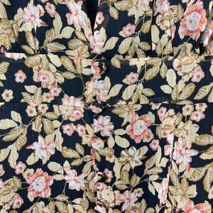 Fitted design constructed with a v-neckline and fabric-covered button placket in an antique vintage inspired floral print of pink & tan blooms threaded through with tiny stripes of shimmering gold thread, this dress will get you hooked on being fashionable and feminine!
