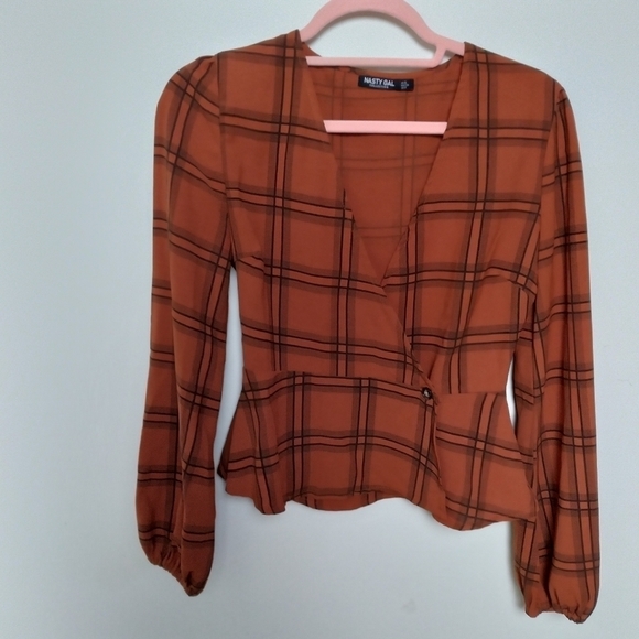 Nasty Gal Orange and Black Plaid Peplum Hem Wrap Blouse Size 2