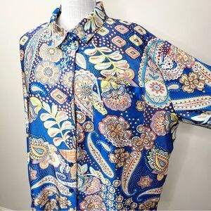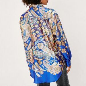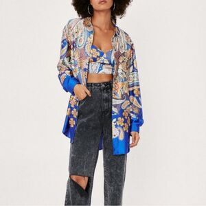 Nasty Gal Paisley Print Oversized Button Down Shirt Cobalt, one chest pocket, button wrist cuffs, split side hems, silky flowy type material with no stretch