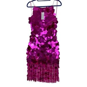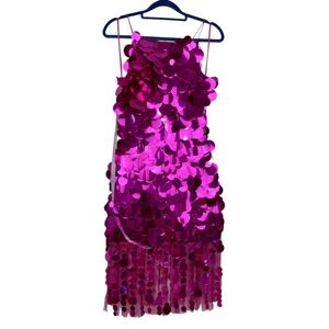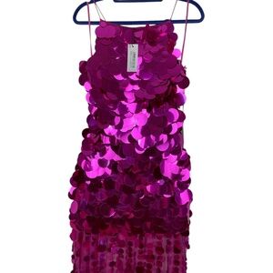 Vibrant pink sequin dress. Sleeveless design. Eye-catching and bold.