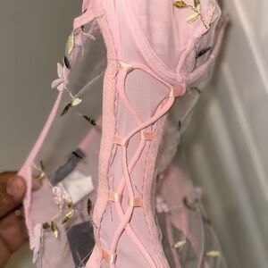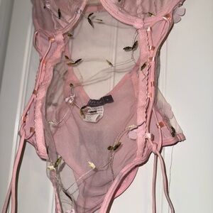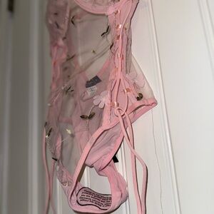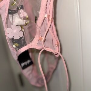 This Nasty Gal shapewear in a soft pink hue features a sheer lace design with intricate floral patterns. The piece is crafted with thin spaghetti straps and a plunging neckline, offering a sensual and elegant look. High-cut sides and adjustable ties add a touch of sophistication to this intimate wear.