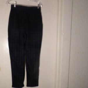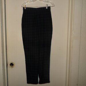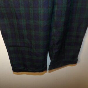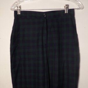 green /black plaid pattern , straight leg has permanent cuff at hem , no pockets no belt loops , material is 65% Polyester 35% Viscose , Sz 2 Rise measures 12" Inseam measures 28" waist lying flat measures 13.5" , good used condition no issues shows minor washing wear , pet friendly non smoking home