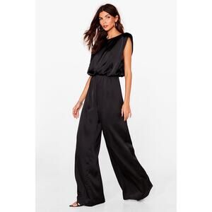 Shoulder 'em who's boss. This jumpsuit comes in satin and features a crew neckline, padded shoulders, relaxed, wide leg silhouette, V neckline at back, and elasticized waist. Pair with heeled mules, oversized hoop earrings, and a super cute shoulder bag. Or swap out for chunky trainers for an easy off-duty look.