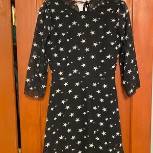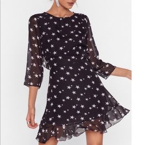This dress features a star print and ruffle detailing throughout, open back, crew neckline, and tie closure at back.
