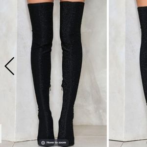 Sparkly black over-the-knee boots worn once (they just are a bit too big for me). Size 6. Purchased from Nastygal.com