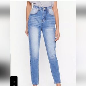 Nasty Gal - Two Toned High Waist ‘Mom Jeans’ - Two toned colored denim in a med-wash and light-wash combo - 5-pocket detail - Zip & button closure -- High- Waist - Waist measures 15” across laid flat - Inseam is 26” - size 6