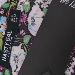 This eye-catching mini slip dress from Nasty Gal is perfect for any social occasion. Featuring a vibrant floral pattern in bold shades of black, purple, and green, its tie straps add a touch of feminine charm.