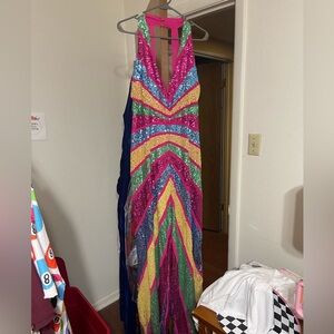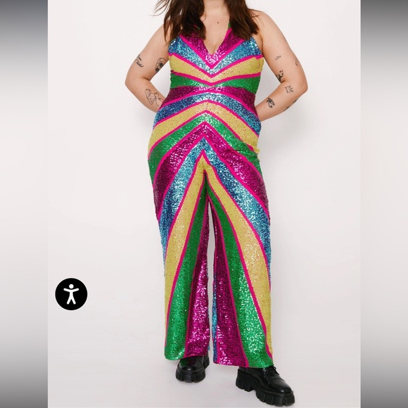 Eye-catching jumpsuit with bold sequin stripes. Features a mix of pink, green, blue, and yellow. Perfect for a dazzling entrance.