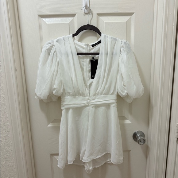 Chic white romper with deep V-neck. Features puff sleeves and fitted waist. Perfect for stylish outings.