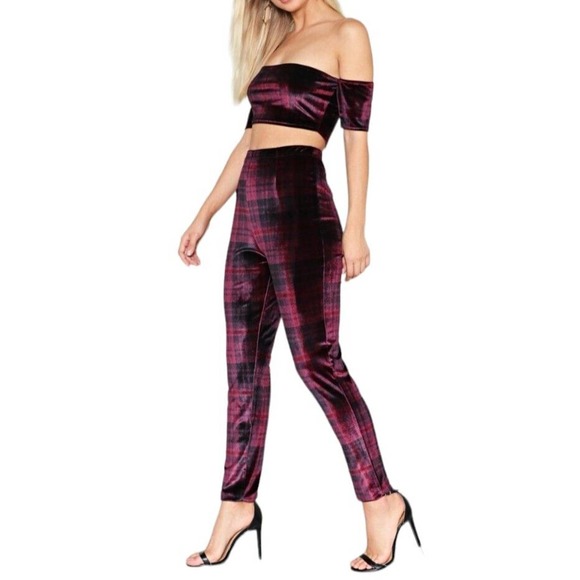 Nasty Gal Women's Pants & Top Set Plaid About You Maroon Co Ord Velvet Velour Outfit