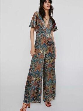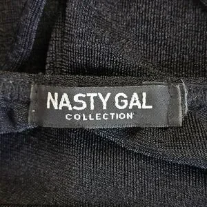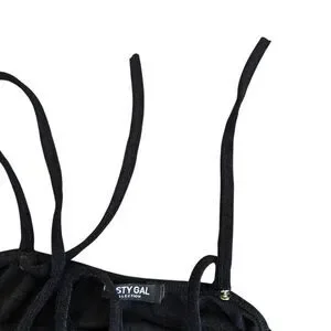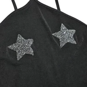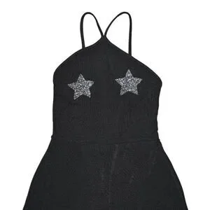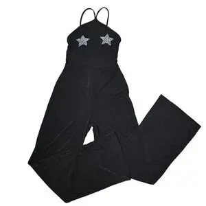 Nasty Gal Women's Star Embellished Black Halter Jumpsuit. Elevate your style with this chic black jumpsuit featuring eye-catching star embellishments on the chest. Perfect for a night out! Color is black with silver embellished star detailing.