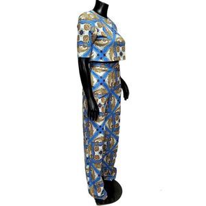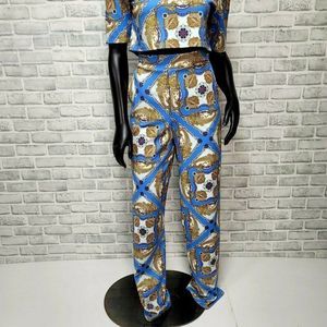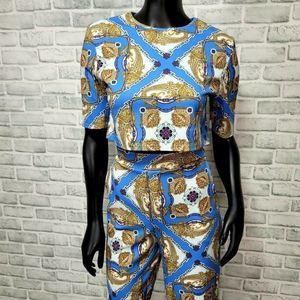 Details: Blue and Gold Chain Filigree 2pc Crop Top Wide Leg Pant Set. Pants have elastic waistband and pockets