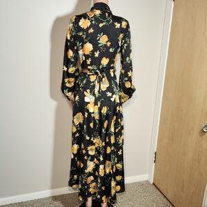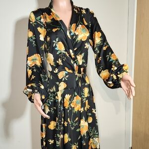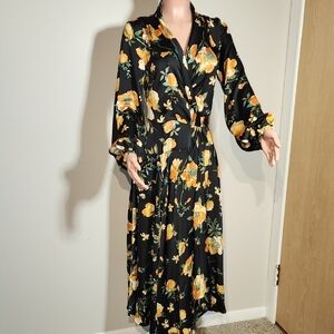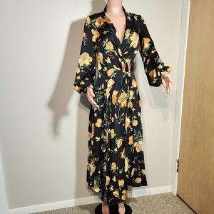 Step into elegance with the Nasty Gal gown, featuring a striking yellow and orange floral design. This long sleeve dress boasts a dramatic plunge neckline and bishop sleeves, perfect for making a statement at weddings or cocktail events. The notched collar adds a touch of sophistication, while the flowing silhouette ensures graceful movement. Ideal for those special nights out, this dress combines style and comfort effortlessly.