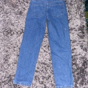 very nice blue denim jeans with little slits on the bottom sides. they are high rise and size 4 and they run long. I’m 5’3” and they are about 4 inches too long. Never worn and new with tags.