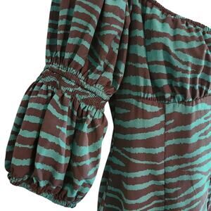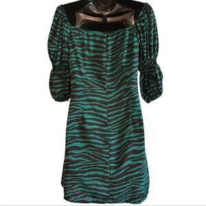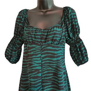 Nasty Gal zebra print dress is green & black and features a ruched bust, button front, and puff sleeves. Size 6, new with tags, excellent condition.