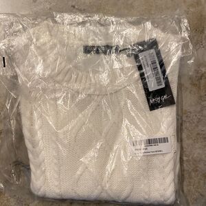 A white cable knit crop top by Nasty Gal in size large. Comes in original packaging, new with tags. Adorable with mom jeans or skinnies and booties! Please see size chart in photos for accurate fit!