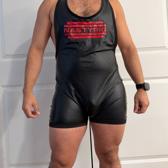 For you gearheads Nasty Pig made this one out of lightweight matte rubber with four-way stretch. Glossy laser cut logo branding on front and racer back. There's no extraneous zipper on this style. Just drop 'em around your knees and have at it. Machine washable.
