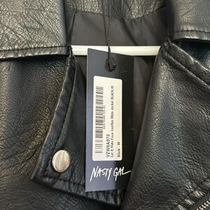 Never worn, new with tags, black zip up leather jacket with silver details, smoke free home