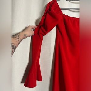 NastyGal Red Flared Long Sleeve Mini Dress. Features a square neckline and flared cuffs on the long sleeves. Perfect for Valentine’s Day or a date night. Stretchy. Size 4.