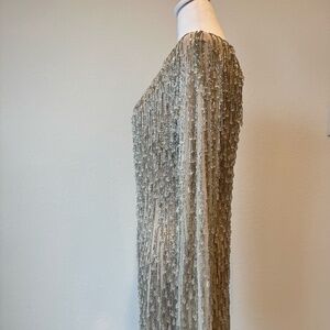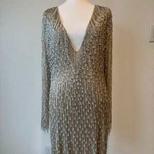 NEVER WORN w/Tags still attached . Fully beaded , long sleeve, v plung neck line ,midi length dress. US Size 10 / UK Size 14.