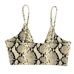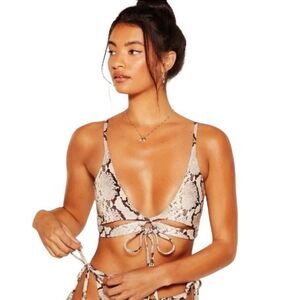 Super cute pre-owned Nastygal Tan Snakeskin Cutout Tie Detail Triangle Swim Bikini Top Size 8. Can wear as a swim bikini top or as a going out crop top. Top is lined but not padded. No stains or holes. Please ask all questions before purchasing.