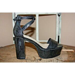 Faux leather and feature an open toe, strappy design, platform heel, block heel, snake print, and ankle strap with square buckle closure. .