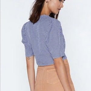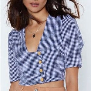 To take this baby home. The Wooden It Be Nice Top comes in gingham and features a cropped silhouette, angular neckline, and button closures at front.