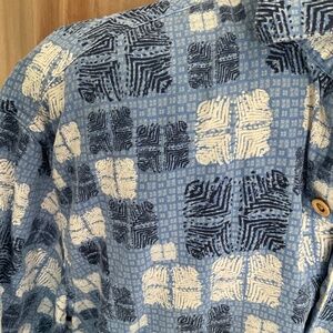 Nat Nast Button Blue 70% Silk 30%Cotton Camp Shirt Sz L Hawaiian geometric