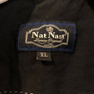Stylish Nat Nast Hawaiian print button-up shirt in navy blue, made from a silk blend material. Size XL. Perfect for men who prioritize comfort and style.