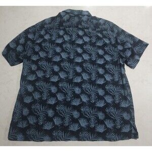 This Nat Nast Luxury Originals shirt features a black background adorned with blue palm leaves, perfect for a summer or spring party or casual occasion. The short-sleeved button-up shirt is made from a lightweight silk blend knit, ensuring comfort in all seasons. The collared neckline and spread collar style add a touch of elegance to the Hawaiian-themed design.