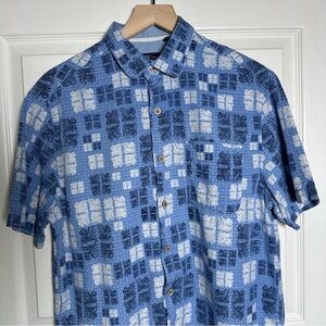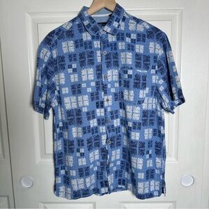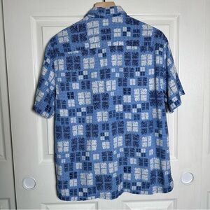 The Nat Nast Men's Medium Luxury Originals Silk Cotton Short Sleeve Blue Cruise Geo shirt features a collared neckline, button closure, and a geometric blue cruise pattern. Made from a luxurious silk and cotton blend, this shirt is lightweight, packable, and easy to care for, making it perfect for travel or casual occasions in the summer, fall, or spring. The spread collar style, button accents, and graphic print add a touch of sophistication to this classic and stylish shirt, ideal for a beach, resortwear, or Hawaiian-inspired look. Vacation, cruise, Hawaii themed.