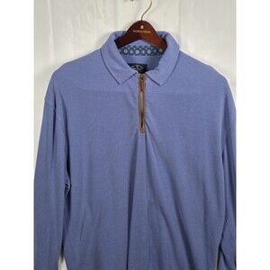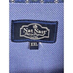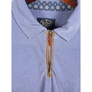 The Nat Nast Men's XXL 1/4 Zip Cotton Pullover is a stylish and comfortable sweater suitable for casual occasions in the winter, fall, or spring. Made from tight-knit cotton fabric in a solid blue color, this pullover features a collared neckline, long sleeves, and button/zipper accents. With a regular fit and size, this pullover is easy to care for with machine washable instructions. Designed for walking and golf activities, this