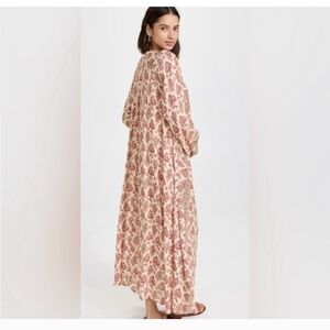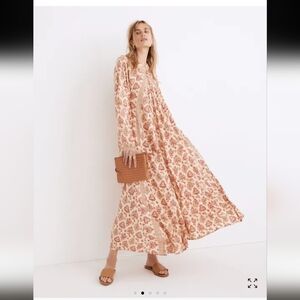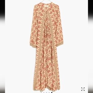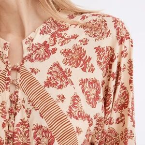Chic long sleeve dress with red floral patterns. Cream background enhances elegance. Ideal for versatile styling.