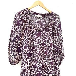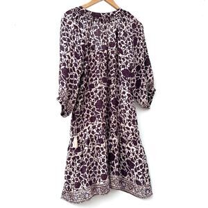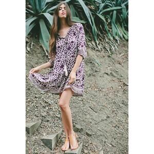Stylish mini dress with a vibrant purple and white pattern. Lightweight and flowy design. Perfect for casual outings.