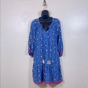 In a bright blue floral design with a bright pink trim and tasselled neck tie, this easy mini dress is a must have for summer in super soft silk.