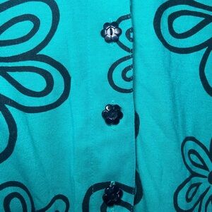 bright turquoise sleeveless romper with adorable black flower shaped buttons, perfect for lounging by the pool